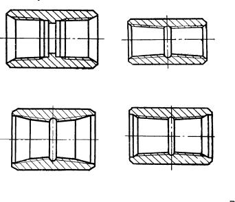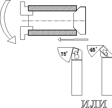 Рис. 15 Расточка внутреннего конуса муфты. Резец S32S-CSKPR 12 В случае использования станка с ЧПУ образование конуса производится за счет программы. При использовании обыкновенного станка правильность направления угла конуса обеспечивается настройкой конусной линейки. В качестве инструмента используются расточные резцы с углами j=75° или j=45°, а также резцы-вставки, закрепленные в специальные блоки или державки. Углы в плане в последнем случае рекомендуются те же. Снятие внутренней фаски, обработка внутренних выточек., и конических расточек на входе муфт. Стандартами предусмотрено большое разнообразие исполнений конструктивных элементов муфт со стороны торцев. (См. рис. 16)