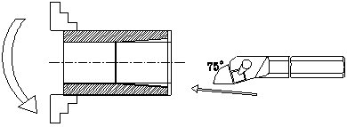 Рис. 14 Проточка муфты по наружному диаметру может производиться разными типами проходных резцов. Резцы PSSNR 3225P15 и PSRNR 3225P15 Подрезка торца муфты. Подрезка торца может быть осуществлена тем же инструментом, что и в случае подрезки торца трубы. Поэтому отдельный эскиз и описание здесь не приводятся. Следует отметить, что на этой и последующей операциях все они производятся два раза (для двух сторон муфты). Расточка внутреннего конуса муфты.