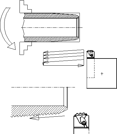 Рис.19 Многопроходное нарезание наружной резьбы многозубой резьбовой пластиной.