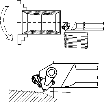 Рис. 20 Многопроходное нарезание внутренней резьбы однозубой резьбовой пластиной.