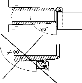 Если у Вас нет специальных приспособлений для выверки правильности установки инструмента, можно использовать, например, подрезанный торец трубы для проверки параллельности ему державки инструмента. Однако ни в коем случае нельзя настраивать инструмент путем установки параллельности верхушек его зубьев проточенному конусу трубы. Угол наклона линии, проходящей через вершины зубьев гребенки или пластины, никогда не равняется углу уклона конуса! Настраивая инструмент подобным образом, Вы гарантированно получаете искаженные углы профиля. (См. рис.22).