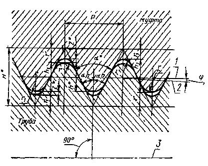 Примечания к табл.3: 1) шаг резьбы P измеряется параллельно оси резьбы трубы и муфты; 2) отклонения по шагу резьбы на длине, не превышающей 25.4 мм, допускаются для расстояния между любыми двумя витками полной резьбы; при расстоянии между витками более 25.4 мм допускается увеличение отклонений пропорционально увеличению расстояния, но не свыше указанных в таблице для всей длины резьбы; 3) предельные отклонения по половине угла профиля относятся к углу между стороной профиля и перпендикуляром к оси резьбы трубы и муфты; 4) предельные отклонения конусности (отклонения от разности двух диаметров) приняты на длине резьбы 100 мм и относятся к среднему диаметру резьбы трубы и муфты, а также к наружному диаметру резьбы трубы и внутреннему диаметру резьбы муфты; 5) предельные отклонения величины радиусов r и r1 даны для проектирования и изготовления резьбообразующего инструмента. Параметры трапецеидальной резьбы приведены на рисунке 4 и в таблице 4