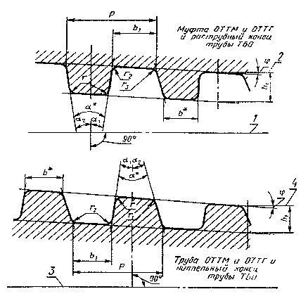 Рис. 4 1- ось резьбы муфты ОТТМ и ОТТГ и раструбного конца трубы ТБО; 2 - линия, параллельная оси резьбы муфты ОТТМ, ОТТГ и раструбного конца трубы ТБО; 3 - ось резьбы трубы ОТТМ, ОТТГ и ниппельного конца трубы ТБО; 4 - линия, параллельная оси резьбы трубы ОТТМ и ОТТГ и ниппельного конца трубы ТБО. Параметры трапецеидальной резьбы по ГОСТ 632-80. Таблица 4